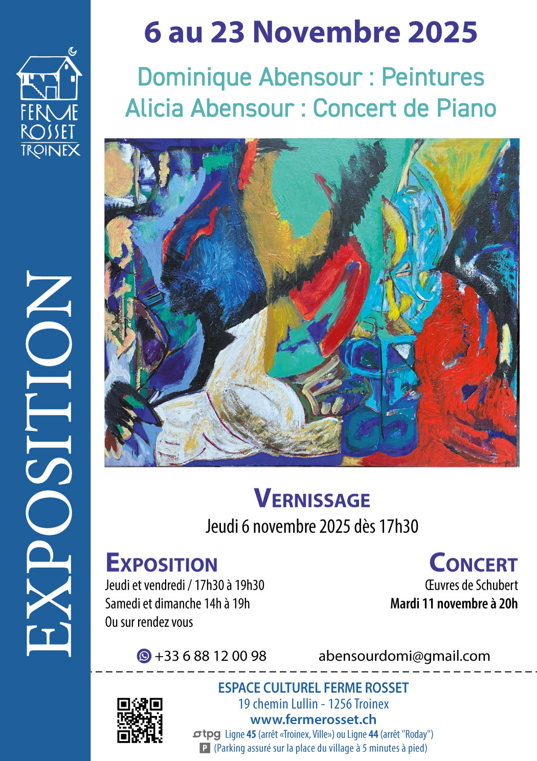 Evénements Exposition – Peintures de Dominique Abensour Du 6 au 23 novembreVernissage le jeudi 6 novembre dès 17h30Ferme Rosset (19, ch. Lullin)Voir le flyer