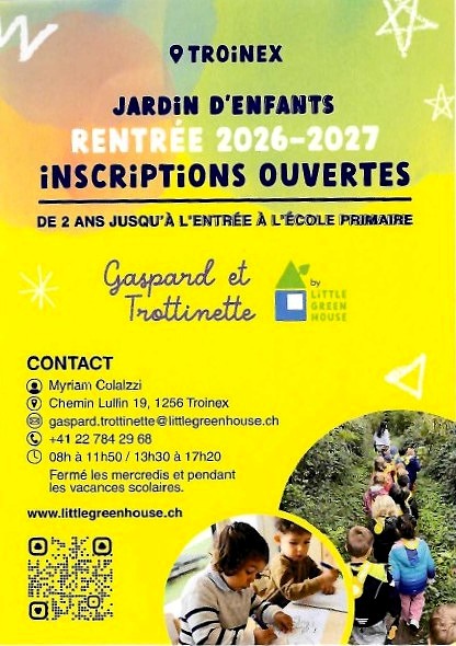 Vivre ici Jardin d’enfants Gaspard et Trottinette : les inscriptions pour la rentrée 2026-2027 sont ouvertes ! C’est le moment d’y penser ! Les inscriptions pour la rentrée 2026–2027 du Jardin d’enfants Gaspard et Trottinette sont désormais ouvertes.Voir ci-dessous pour plus d’informations :