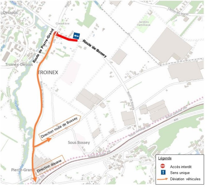 - L’exception consiste à la fermeture complète de la route de Troinex le jour de la pose du tablier avec un engin de levage de grandes dimensions, positionné sur la route de Troinex, cela vers fin mars début avril 2026.
